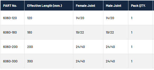 Compliance with ASTM. Drip Tip. Inter changeable Inner & Outer Joints. Made from Heat Resistant, Low Expansion 3.3 Borosilicate Glass.