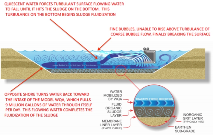 - Oxidizes, through continual vertical mixing, all of the trapped waste gases (nitrogen, ammonia and H2S) in the water column and sludge, thereby cleaning the water.