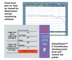 Easy to adjust on your screen and not inside the well. Unlike traditional floats or probes which may be difficult to adjust, the Watertronics Lake Level Control activation level can be simply adjusted by the operator on the screen. They are managed by either Watervision on the PC or via VirtualVision Touchscreen operator interface. Reservoir and set-point levels are displayed in inches.
