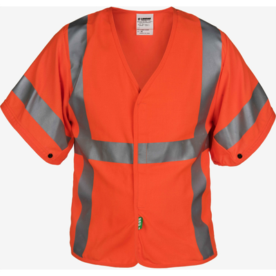 Lakeland`s Class 3 high-visibility vest in orange features sleeves and a hook and loop front closure. The silver HT trim provides greater visibility. Meets ANSI 107-2010 and is FR-treated.