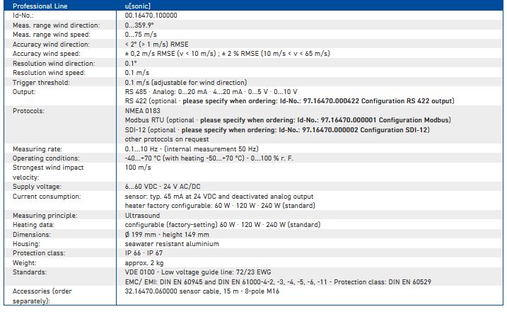 for wind direction and wind speed. The seawater resistent sensor is perfectly heated and ideal for use under cold climate conditions. The equipment is connected by an 8 pole screw connector. The measured values can be requested over a variety of interfaces.