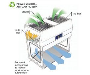 - The purified air travels down to the work zone in a vertical, unidirectional down flow stream, exiting the work zone across the entire open cabinet front area after deflecting off the work surface. Rear wall perforations are designed to reduce work surface turbulence and minimize the possibility of dead air corners in the work zone.