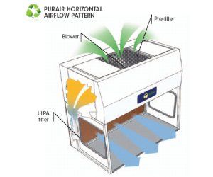 - Air is forced evenly across the ULPA filter in a stream of clean, uniform air within the work zone. This dilutes and flushes airborne contaminants from the interior.