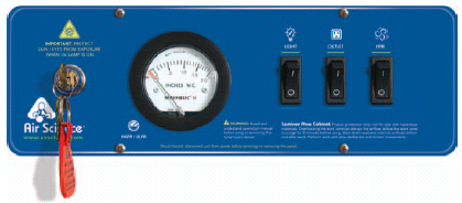 Control panel On/Off switch for fan, lighting, GFCI outlets, Minihelic ULPA pressure gauge to measure filter performance, UV lamp key switch.