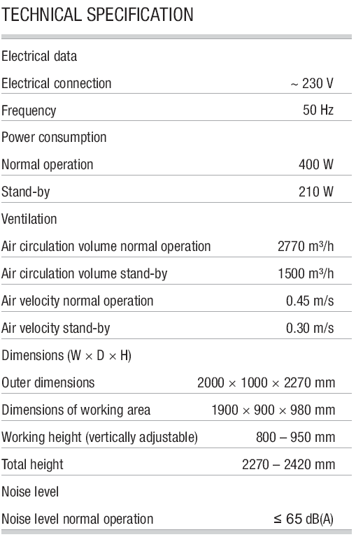The components of the laminar flow workstation are made of 1.5 mm stainless steel, GMP and FDA conform. For visible surfaces a fine grit grinded material, Ra < 0.8 pm, is used. The assembly of the workstation is performed on a special stainless steel clean room profile (sampling inspection is possible). Weld seams at junctions are grinded and brush- inished invisible. The side panes are made of safety