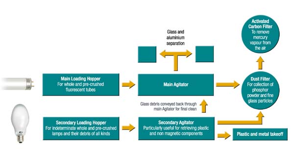 Feeding one type of lamp at a time, such as fluorescent tubes, will produce glass cullet and just one type of component, such as plain aluminium end caps. But feeding a mixture of lamp debris made up from modern lamps, such as energy saving lamps, which contain a high proportion of plastic components as well as metal pieces will produce a similar mixture of materials but free of glass! It is for the client to collect this in any desired way.