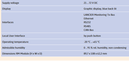 The Rail-Module-Bus by LANCIER Monitoring is a modular and robust sensor system. Several measuring modules are mounted on a DIN rail and are directly connected to one another by means of plug-in contacts. The RM-Basic module is the core of the new Rail-Module-Bus by LANCIER Monitoring. It takes over the energy supply of the measuring modules, shows the measurements and parameters and transmits the readings to a superordinate control system via one of the integrated interfaces. The RM-Basic module display is also used to set the thresholds of the connected sensors.