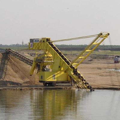 The land-based bucket chain excavator moves evenly along an slope on tracks during dismantling. The dredging depth is limited by the length of the bucket ladder, the sag chain, the dead weight of the dredging car and the permissible angle of slope in front of the stand.