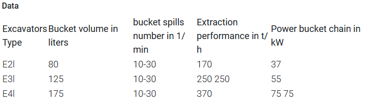 The excavator material is dragged upwards in the freely suspended, unguided lower mount of the bucket chain over the slope and brought to the kick-off. After the buckets have left the water, pre-drainage takes place by letting the water leave from the drainage slots provided for in the buckets. When the drop-off point is reached, the material is transferred to an intermediate silo. The bucket chain excavator can also be equipped with a dewatering device.