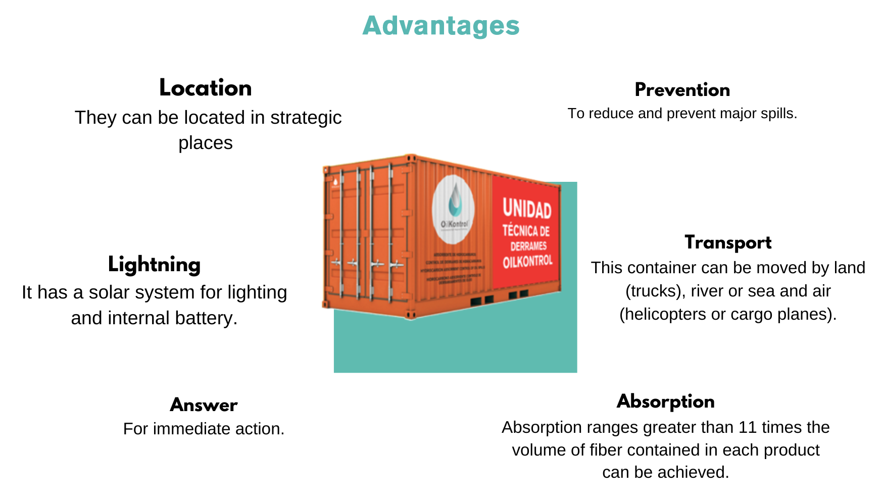 This container can quickly reach any site regardless of its geography. Given the diversity of possible scenarios where spills can occur, three specific units have been designed with the appropriate elements for each case. Although the design is of a standard type, it can be adapted to the requirements of the companies based on the casuistry or risk analysis that they have of the sites under their exploitation. The equipment has a set of OILKONTROL absorbents that use bulk fiber as a base to guarantee the efficiency of operations where, depending on the product, absorption ranges greater than 11 times the volume of fiber contained in each product can be achieved, and this It is due to its particular structure.