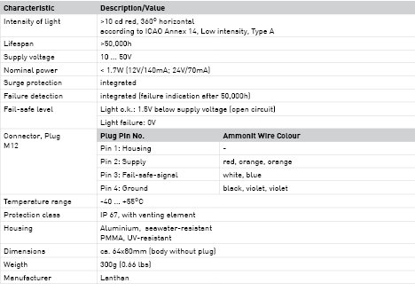 Light Intensity 10 Candela, colour: red. Power Consumption < 1.7 W. Low power consumption, ideal for autonomous systems. Materials: Aluminium EN AW 6082 / PMMA. Maintenance free due to fail safe LED-technology. > 50 000 hours operating capacity. Wide operating voltage (10...50 VDC).