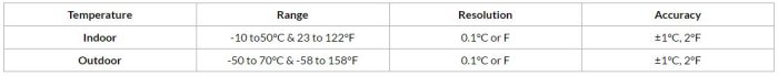 Simultaneously displays internal and external temperature on a 3 3/16` x 2½` LCD, large enough to be read across a room. Useful as an indoor/outdoor thermometer, in incubators or anywhere simultaneous internal and external readings are required. Has min/max temperature memory. Can be wall mounted or freestanding with easel back. Recall min/max readings over any time period or have it automatically reset itself every 24 hours. The outdoor sensor is mounted on a cord over 4’ long. Comes with 1 AAA battery which lasts a full year. N.I.S.T. traceable certificate of compliance available.