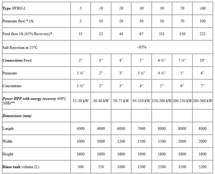 * under standard conditions: TDS 35.000ppm, temperature = 25oC, pH = 8