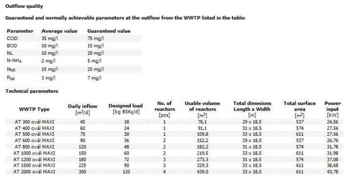 Wastewater treatment plants AT 300 to AT 2000 oval MAXI are designed for centralized wastewater treatment solutions in municipalities up to 2000 PE. Capacitively suitable for sewage sources from 45 to 300 m3 / day. They are supplied as a complete technological line supplemented by a pumping station with mechanical pre-treatment, homogenization tank, sludge management and a complete technical infrastructure. The parallel connection of individual biological reactors ensures the possibility of staged construction.