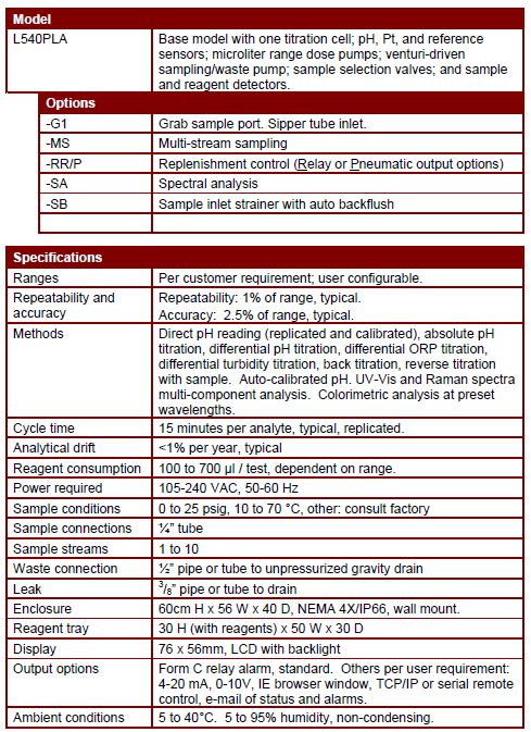 Through its display and keypad or optional Ethernet interface, users can view process status and history, and modify analysis intervals and other configuration parameters. This L540 offers a variety of hardware options for stream selection, sampling, sample preparation, and sample/reagent delivery to accommodate specific customer requirements.