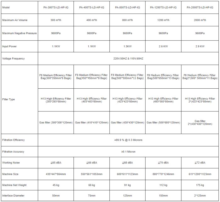 - TS-IQ, TD-IQ, FS-IQ series are equipped with low power consumption, maintenance-free, high-volume brushless fans, stable operation and long service life. The TS-LD-HP-IQ series is equipped with a high negative pressure brushless fan with large suction power;