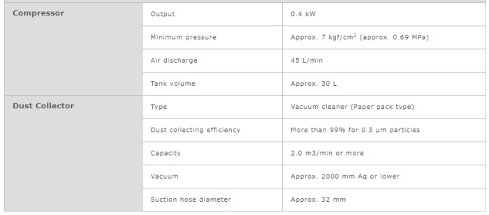 - Required power supply: 115/230VAC(±10%), 100VA, 50/60Hz (excluding dust collector and compressor)