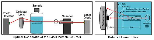 Utilizing the principle of "near angle light scatter", a revolving laser beam passes through the walls of a glass container of a flow-thru cell. When it is directed through a central "sensitive zone" the PC-2200 not only counts the particles in suspension, but tabulates their size as well. The analog signals generated by the light pulses are routed to a computer and digitized.