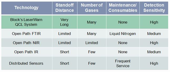 The Quantum Cascade Laser-based technology behind LaserWarn provides significant advantages over competing technologies. LaserWarn provides much larger detection distances and greater sensitivity than conventional IR and FTIR systems. The system detects a wide range of gases, and requires minimal maintenance.