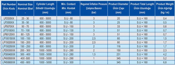 Part Numberl: LP2535XX. Nominal Size: 25-30. Cylinder Length: 600 - 5000. Min. Contact: S.U-80. Reguired Inflation Pressure: 3. Product Diameter: 20. Product Total Length: S.U + 160. Product Weigth: 0,4.