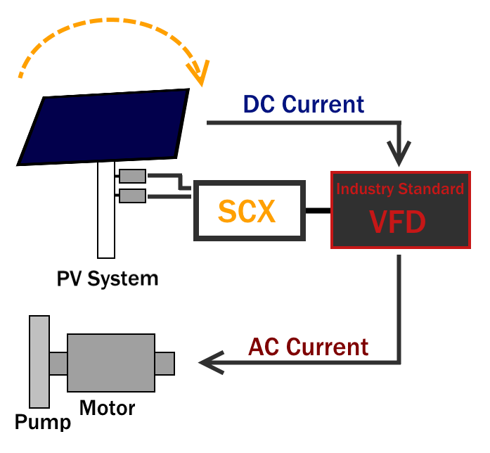 Pumps that require more than a few kilowatts of energy are most typically powered by 3-phase AC motors. Solar panels provide a DC current, however, so an inverter, or Variable Frequency Drive (VFD), is necessary for conversion. While running, a water pump will need different amounts of power depending on the amount of water available for pumping and the amount of water needed. A VFD changes the frequency and voltage of the AC current to compensate for the motor’s variable workload. Lauritzen’s solar pump controller makes use of an industry standard line of VFDs. It’s coupled together with the SCX solar tracker controller for maximum output throughout the day and uses advanced maximum power point tracking (MPPT) technology to maximize efficiency.