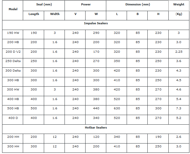 Ideal for Sealing heat sealable poly pouches. Hand operated Impulse (instant) sealing. Hot bar sealers for laminated pouches electronic timer. Adjustable electronic timer. Audio visual sealing indicators. Suitable for packing granules, solids, and powders. Round element option for simultaneous cutting and sealing.