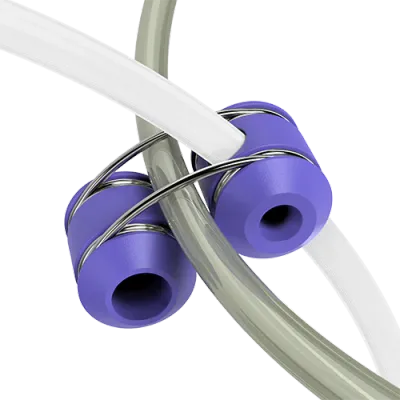 To hold solvent lines in place, use tubing clips to affix 1/16" and 1/8" polymer tubing to beakers, flasks, or bottles. With a long-lasting stainless-steel spring, this convenient device holds tubes precisely where they should be, attached to containers with up to 4 mm wall thickness.