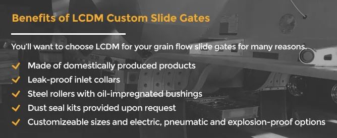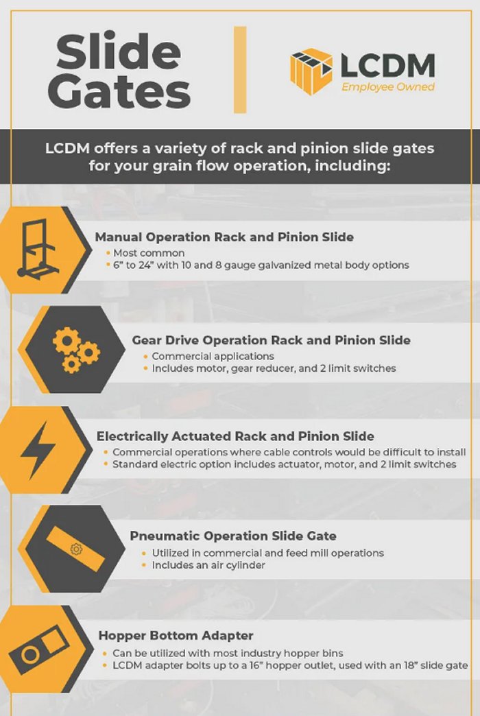 You’ll want to choose LCDM for your grain flow slide gates for many reasons. Our slide gates are a product of our own unique design made to maximize efficiency. To ensure quality, we build all our rack and pinion slide gates in our facility.