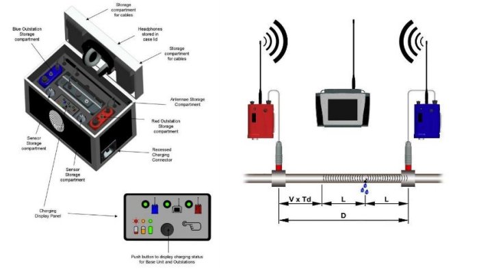 MicroCorr Touch measures the time difference between leak noise signals arriving at each sensor. The leak position is determined by relating this difference in propagation (travel) time to the velocity of sound along the pipe and to the measured distance between the sensors.