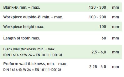 The machine is specially designed for spinning and flow forming of preforms out of blanks and the profiling of external and Internal gears on two different chucks. The following work pieces can be manufactured on this machine: Spinning and flow forming part with cup shape as a preform for external and internal toothed clutch disc carrier by roll forming process out of pressed preforms or other profiling of rotationally parts