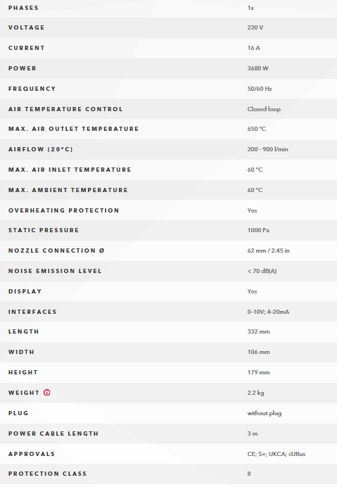 Thanks to its brushless motor, the HOTWIND SYSTEM is durable and requires very little maintenance. Air volume adjustment is continuously variable with the potentiometer up to 900 l/min or 31.78 cfm. The HOTWIND SYSTEM stands out through its application diversity: Remote control of air volume and heating output is possible thanks to an interface with alarm contact. An integrated temperature probe ensures additional precision. The digital display on the HOTWIND SYSTEM enables the ability for users to monitor the tools parameters.