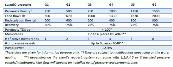 LennRO GREENLINE reverse osmosis system provides low conductivity water from tap water and low brackish water. Lenntech units are ready-to-use, skid mounted, easy to operate. The LennRO gREENLINE come with up to 6 installed Pressure vessel which can be isolated individually. Hereto the system can run on 1 membrane producing 250 l/h and with up to 6 membranes for a production of 1500 l/h.