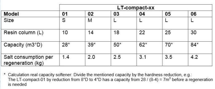 The Lenntech softeners from the LT-compact series use ion exchange to soften the water. The compact series have a compact size, all in one layout and are available with resin columns from 10L to 30l.
