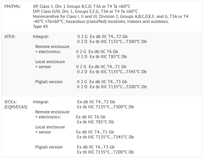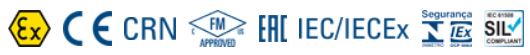 Compliances and Agency Approvals: FM, FMc, ATEX, IECEx, EAC/TR CU, Inmetro. CE mark. PED, CRN.