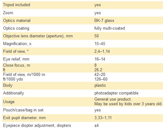 The kit includes a metal tabletop tripod. We recommend using it during observations at high magnification – it will help to avoid the image trembling commonly encountered with handheld observations.