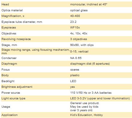 Levenhuk Rainbow 2L microscopes produce 40x-400x magnification – just enough for children’s first biological research. Due to the combined (upper and lower) illumination, these microscopes are suitable for viewing transparent, semi-transparent, and opaque objects - the choice of microscope samples is only limited by a young researcher’s imagination! The microscopes feature lightweight, yet reliable bodies made of plastic. Each Levenhuk Rainbow 2L microscope comes with a Levenhuk K50 Experiment Kit.