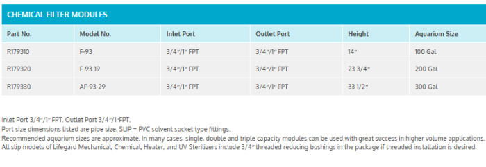 Large Capacity Carbon Chamber, Single capacity holds 7.3 oz.(207 grams) Lifegard Pelletized Carbon. Double capacity holds 15.6 oz. (442 grams) Lifegard Pelletized Carbon. Triple capacity holds 24.4 oz. (692 grams) Lifegard Pelletized Carbon.Can be used as a Biological Chamber when filled with the proper media that provides surface area for beneficial bacterial growth. No channeling. 100% of water passes through media. More than one module can be plumbed together for different media. Automatically vents air out of unit. Removable chamber allows easy media replacement and pre-rinsing Carbon can be easily prerinsed while inside chamber. Holds a variety of filter substances such as Zeolite, Ion Exchange Resins or other biological media.