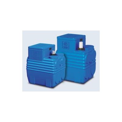 90 and 150 litres version for one pump directly installed. Walk-over cover. O-ring seal between tank and cover. Simplified inlet, outlet and air venting pipe connections with seal. Integral lifting handles. Fitted for emergency emptying using a tap. Patented airtight cable gland allowing easy pump removal for any maintenance work. The side fins, in the middle of the tank, guarantee an excellent grip if the unit is installed in-floor (refer to relevant manual).
