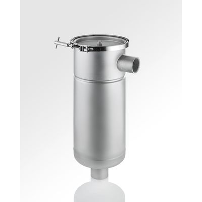 The light stainless steel design with a side intake principle. The special design feature is the light stainless steel design with side intake principle, which prevents the suspension running on or overflowing when the housing cover is open. The V-clamp enables the cover to be opened and closed easily. It is installed so that it is self-supporting, using a base frame or wall attachment clips. The low-priced EL variant can only be delivered in the standard version.