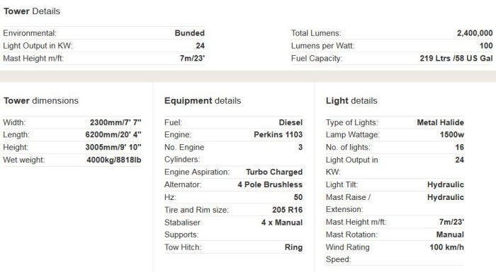 The MSL24K-7 is a 7m lighting tower with 16 1500W metal halide lamps and hydraulic operational features, available in skid or double axle trailer mounted configurations.
