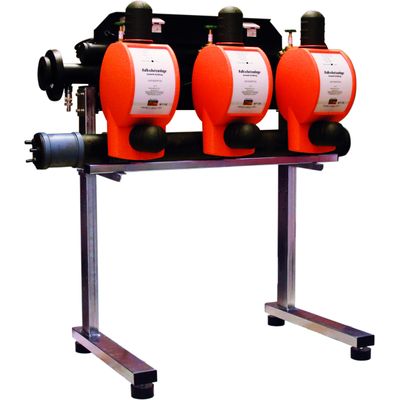 Modularly constructed compact unit, independent single units (PN 10), individually lockable for maintenance purposes, with integrated water meter, electrolytically working crystal generator with microprocessor-controlled treatment current. Automatic determination and display of the rinsing time and the replacement interval of the limescale protection unit. Operation and function indication by LEDs, patented safety module for termination of the rinsing process in case of power failure. With electric motors for automatic cathode cleaning and discharge of excess lime into the drain line, german VDE-tested power supply unit, complete with internal system piping.