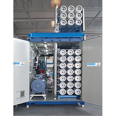 - The plant needs only hydraulic and electrical interconnections on site from and to the plant by flanged connections for the easiest plugging to the raw water source and to the product water storage tank and discharge piping.