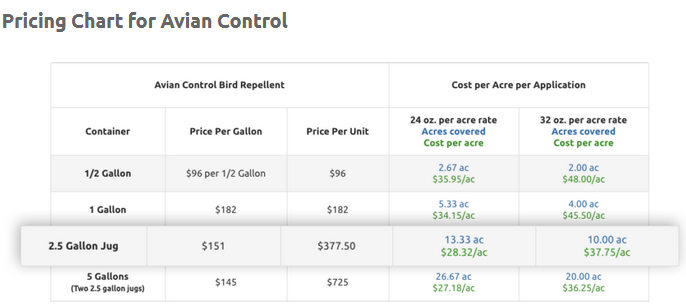 Avian Control can be used on numerous crops to prevent damage from foraging birds. This liquid bird repellent is effective against many types of nuisance birds including pigeons, starlings and grackles. Here is some information pertaining to everything Avian Control:
