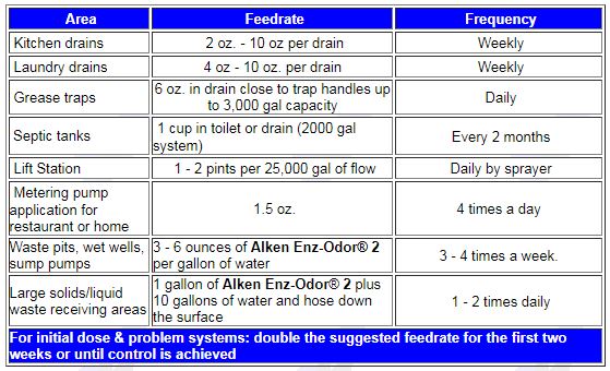 A few Alken-Murray distributors have chosen to dilute ALKEN ENZ-ODOR® 2 so that a higher volume slug can be delivered more than once a day, which also allows authorized distributors to deliver a 5 gallon pail of stabilized diluted product monthly to their clients, timing pail change-out to coincide with trap inspection and pump, if necessary. To do this for a 3,000 gallon grease trap, add 1.5 gallons of ALKEN ENZ-ODOR® 2 to 3.5 gallons of water and hook up to metering pump to deliver 4 oz. of diluted product 5 times daily. Please relabel product with "private label", if you dilute regular strength product in this manner.