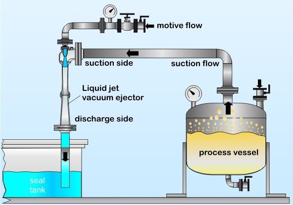 Liquid jet vacuum ejectors suck off gases and/or vapours from a process. The lowest possible suction pressure in the reactor is only limited by the vapour pressure of the motive liquid. It is possible to compress to atmospheric or even higher pressure.