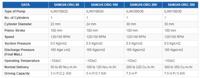 The Liquid Oxygen Pump is a single acting piston pump. It is used for filling Oxygen into Cylinders upto a pressure of 165 kgs./cm2. SANGHI - ORG Liquid Oxygen Pump. The pump is designed for assembly in air separation unit that works by pumping liquid Oxygen and gasifying the same in Heat Exchangers for final filling as gas in Cylinders. Control of liquid feed is not necessary, because the pump is designed in accordance with the plant size and the liquid produced is constantly pumped off. The drive unit is similar to any reciprocating machine with the Crank Shaft, Flywheel, Connecting Rod, Cross Head, etc. The Liquid Oxygen Pump consists of a stainless steel inside liner with liquid inlet and evaporated gas outlet ports. There are no valves on these ports, which are closed by the piston itself on the pressure stroke.