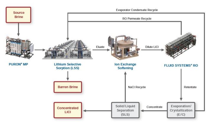 Through various points of water recycle and a salt recycle stream, the Li-PRO process optimizes water and process chemical usage. Water from the source brine is collected as permeate from the RO and as condensate from the evaporator and recycled back to the LSS process step, minimizing external water usage and associated costs. Salt, collected as sodium chloride, is separated in a final solid/ liquid separation and recycled back to the LSS process step to aid in the chemical regeneration of the ion exchange softener. This effectively reduces salt or other chemical reagent purchases required for ion exchange regeneration. This process can be adjusted to accommodate operations where a salt recycle is not required or preferred.