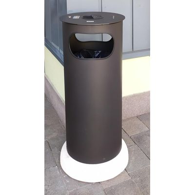 Litter bin with round shape made up of a steel sheet, with ring in steel plate on the top and on the bottom which guarantee stability and no deformation. The introduction of waste is through the two lateral holes. The openable cover in steel sheet has an holed in the middle for the ashtray and can be close with a lock. Complete of ring for the sack. The base could be in concrete or steel. All metal parts are galvanized and powder coated in different RAL colour, and all the screws are in stainless steel.