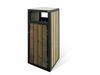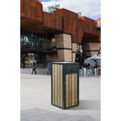 Square-shaped litter bin composed of a frame in rectangular tubular and timber slats.