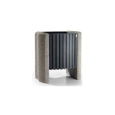 Litter bin made up of a robust steel frame in angular with front panels of the curved surface made up of insert plate, fixed on 2 squares concrete supports dim. L450xH750x130 mm on each side composed of cement and inert river washed. The inner container is in galvanized and powder coated steel sheet provided with side handles for the extraction. The litter bin is supplied with the cover. All metal part are galvanized and powder coated in different RAL colour. All the screws are in stainless steel.